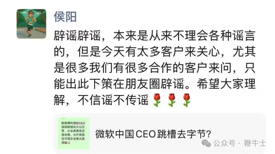 据鞭牛士消息,1月5日,有消息称微软全球资深副总裁,微软大中华区董事长兼首席执行官侯阳,已跳槽去字节火山引擎团队。