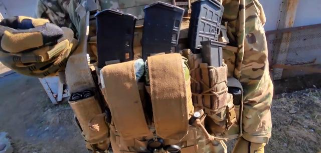 防弹背心正面则是固定着3个步枪弹匣和1个多功能钳,弹匣外面的小包,则可以根据任务灵活搭配。一般都是装手雷用于攻坚,装导爆索用来破障,以及装急救包为了自救互救。