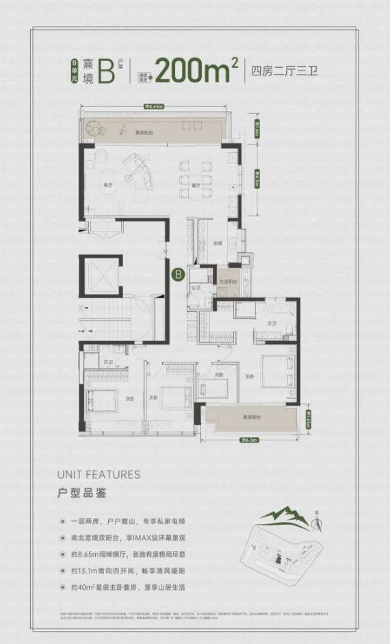 厅北向观山,房南向取暖,算是景观舒适两不误,整个户型设计上没有什么缺点。约200㎡四房两厅三卫3.6米的层高直接打破深圳豪宅天花板,专梯入户保证归家的私密感,室内各功能区空间阔绰,居住舒适度、幸福感将直线上升。搭配约9m景观大阳台,享270°景观面,开窗可见塘朗山景、于山脉之上一眼望尽城市繁华