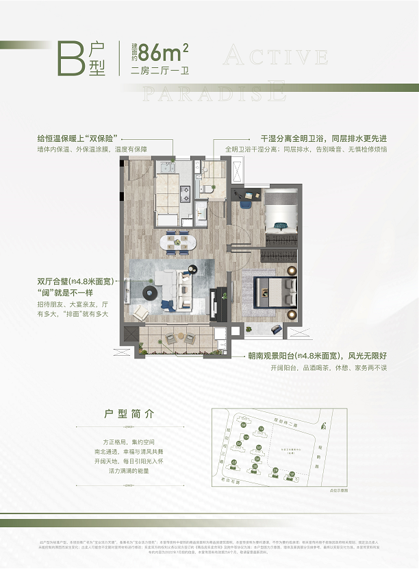 客厅与餐厅连为一体,约4.8米大面宽设计,外连观景阳台,拥揽四季的人生景致。
