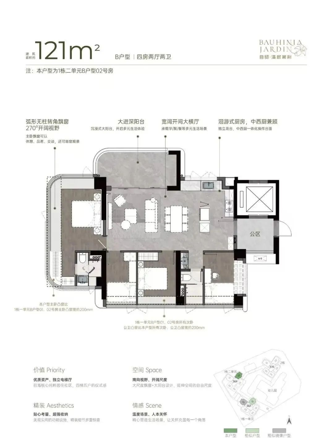 小区有485套纯住宅,车位595个,容积率5.14,共有三栋住宅,每栋做了36-37F高的4梯5户设计,每户都有专梯入户空间。