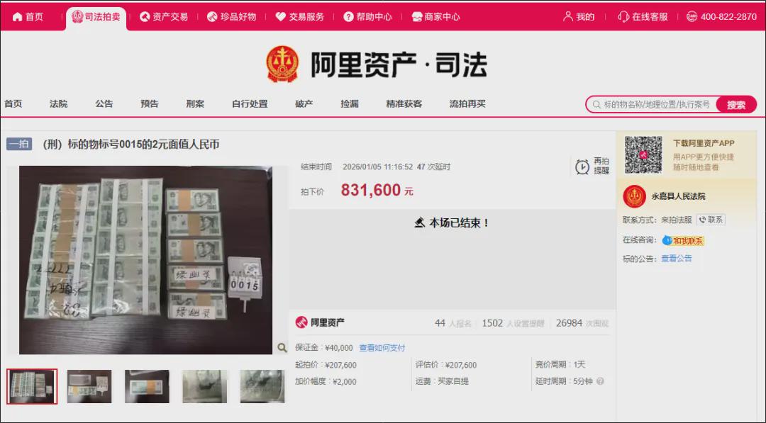 1月4日,浙江温州市永嘉县人民法院以20.76万元起拍价,保证金4万元,增价幅度2000元,在阿里法拍平台拍卖了10500张2元面值人民币,引来44人报名。