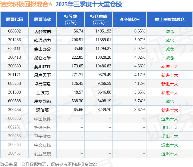 诺安积极回报混合A的前十大重仓股如下: