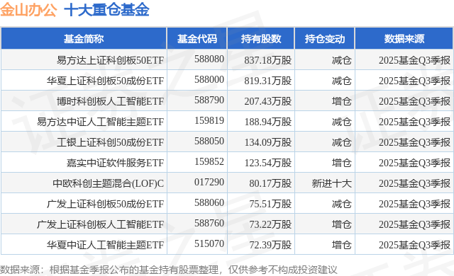 根据2025基金Q3季报公募基金重仓股数据,重仓该股的公募基金共223家,其中持有数量最多的公募基金为易方达基金的易方达上证科创板50ETF。易方达上证科创板50ETF目前规模为767.61亿元,最新净值1.3705(12月31日),较上一交易日下跌1.15%,近一年上涨36.63%。该公募基金现任基金经理为林伟斌 成曦。林伟斌在任的基金产品包括:易方达中证红利ETF,管理时间为2019年11月26日至今,期间收益率为77.39%;易方达中证红利ETF联接发起式A,管理时间为2020年7月8日至今,期间收益率为52.13%;易方达上证科创50联接A,管理时间为2021年3月1日至今,期间收益率为3.84%。成曦在任的基金产品包括:易方达创业板ETF联接A,管理时间为2016年5月7日至今,期间收益率为53.26%;易方达深证100ETF,管理时间为2016年5月7日至今,期间收益率为84.1%;易方达创业板ETF,管理时间为2016年5月7日至今,期间收益率为57.05%;
