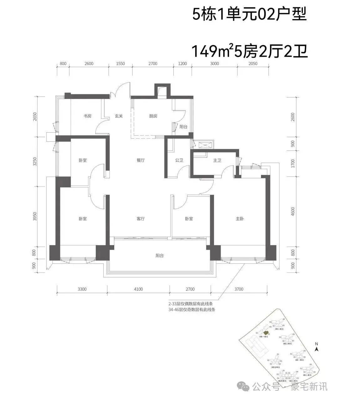 【五栋一单元-平面图】3梯3户,3条腿,分别是01、03号房户型约173㎡的5房2厅2卫、02号房户型约149㎡的5房2厅2卫