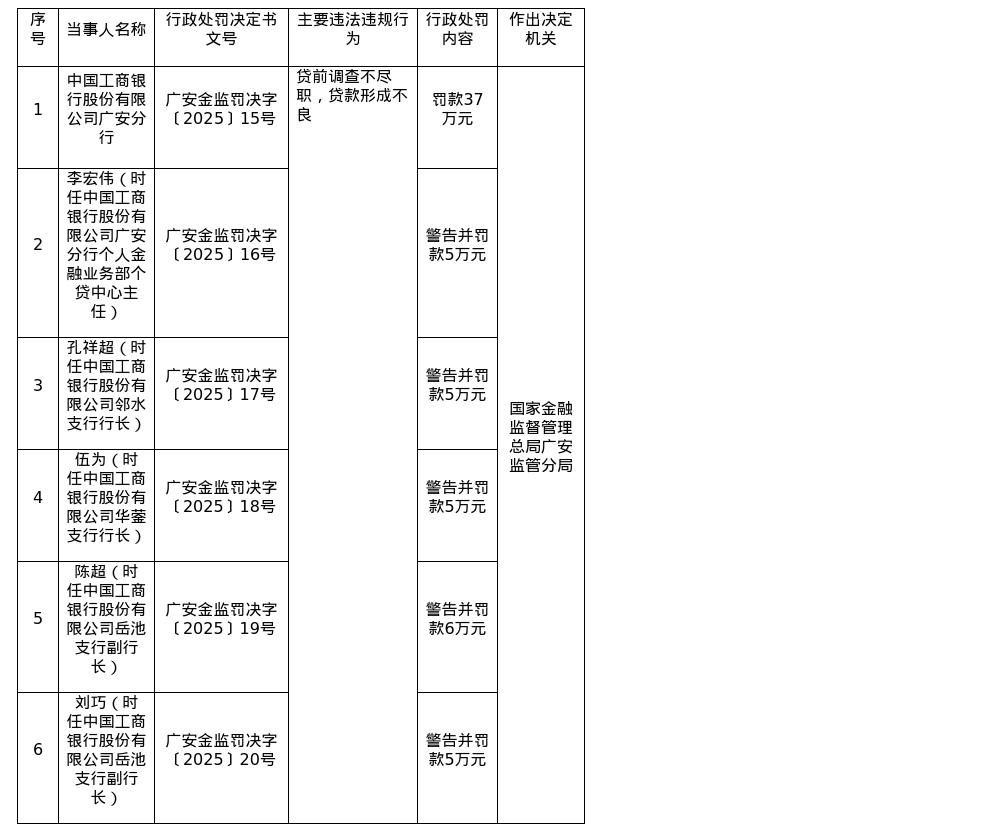 针对这一行为,国家金融监督管理总局广安监管分局对其罚款37万元;对时任个人金融业务部个贷中心主任李宏伟、时任邻水支行行长孔祥超、时任华蓥支行行长伍为、时任岳池支行副行长刘巧,分别警告并处罚款5万元;对时任岳池支行副行长陈超,警告并处罚款6万元。