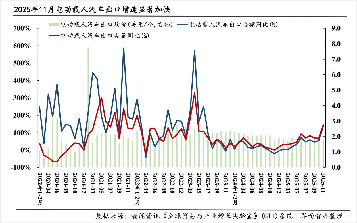 电动载人汽车出口加速增长。11月,电动载人汽车出口数量为39.9万俩,环比增长6.5%,同比增长144.9%、较上年同期加快144.5个百分点、较10月加快76.2个百分点;出口均价为1.8万美元/辆,环比下降6.2%,同比下降2.1%,降幅较上年同期收窄18.6个百分点、较10月收窄6.5个百分点;出口金额为70.8亿美元,环比下降0.1%;同比增长139.8%,较上年同期加快160.2个百分点,较10月加快85.6个百分点。