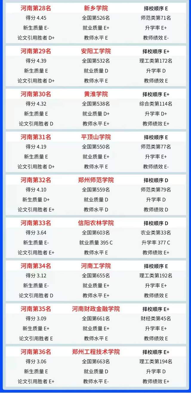 在这份榜单中,基于新生质量、就业质量、升学率等指标进行量化评比,共计36所本科大学上榜,上榜高校既包括河南省仅有的两所“双一流”大学的郑州大学、河南大学,也包括河南省区域重点大学的信阳农林学院、南阳理工学院等。