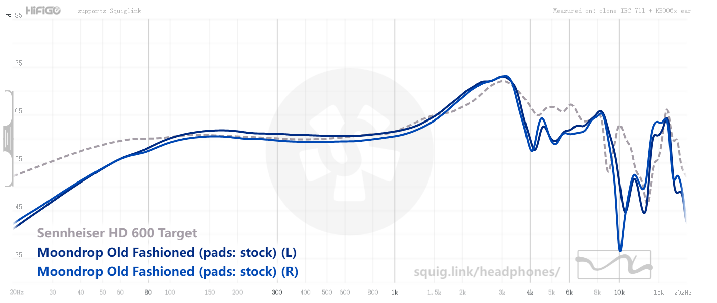 外网截图的一张频响图,目标曲线(虚线)是森海HD600。可见男低音部分70-80Hz还有充足的能量,只是60Hz再往下,那种扎心轰鸣的感觉它会不明显,但考虑到这耳机4k到7kHz之间响应充分度不很足,倒是间接弥补了“极低频”的亏空(此消彼长原理)。也就是说它实际的低频水准“非常不错”!