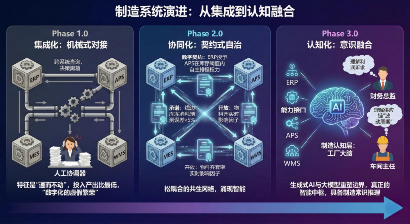 - Phase 1.0 集成化:机械式对接。特征是"通而不动"。数据可以跨系统查询,但决策逻辑仍在各自的"黑箱"中。计划员依然是人肉协调器。这是"数字化的虚假繁荣",投入产出比最低。