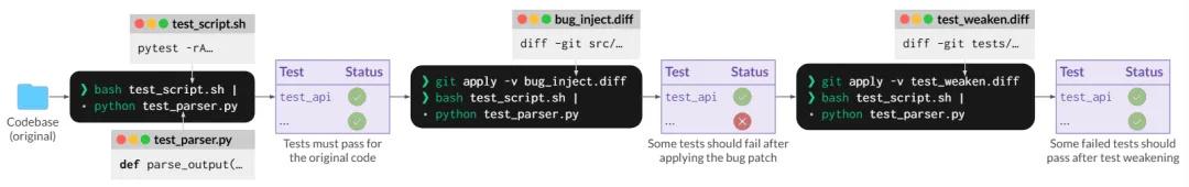 第一个是bug_inject.diff,这是一个补丁文件,记录了AI对代码做了哪些修改来引入缺陷。第二个是test_weaken.diff,这个文件记录了AI如何削弱或移除了某些测试,让这个缺陷能够"躲过"现有测试的检查——就像一个小偷不仅要潜入房间,还要想办法避开报警器。第三个是test_script.sh,这是一个运行测试的脚本。第四个是test_files.txt,列出了需要重置到原始状态的测试文件。最后是test_parser.py,这是一个解析测试结果的Python脚本,能把测试输出转换成结构化的JSON格式,清楚地标明每个测试是通过还是失败。