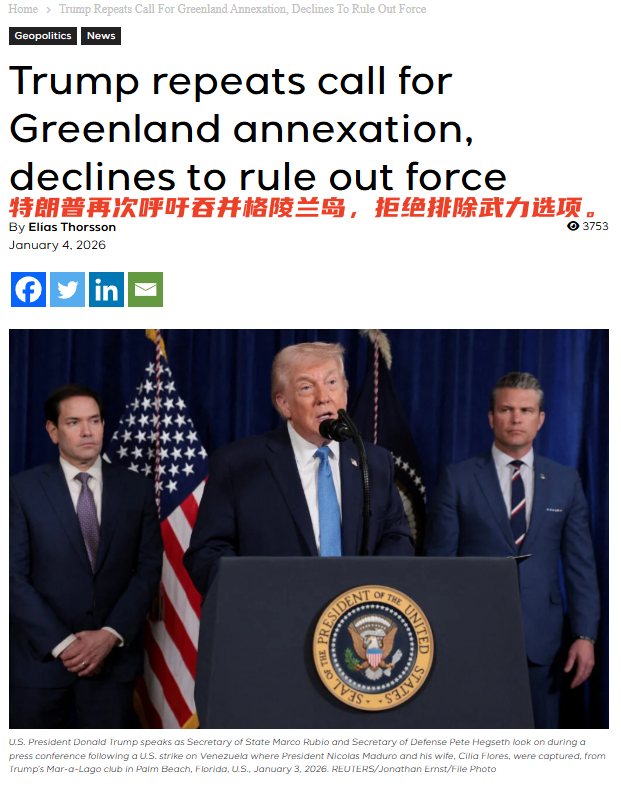 未来20天随着美丹磋商开启,美军大概率会以增兵演习、装备部署等方式持续施压,推进对格陵兰岛的军事包围。