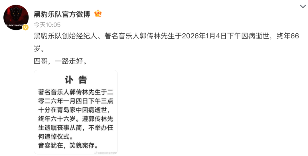 黑豹乐队官方今天(1月5日)微博发布讣告称,遵照郭传林遗嘱,其丧事从简,不举办任何追悼仪式。“音容犹在,笑貌宛存。四哥,一路走好。”