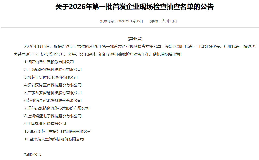 1月5日,中国证券业协会官网发布“2026年第一批首发企业现场检查抽查名单”,蓝箭航天、洛阳轴承、粤芯半导体、汉诺医疗等11家公司被抽中现场检查。