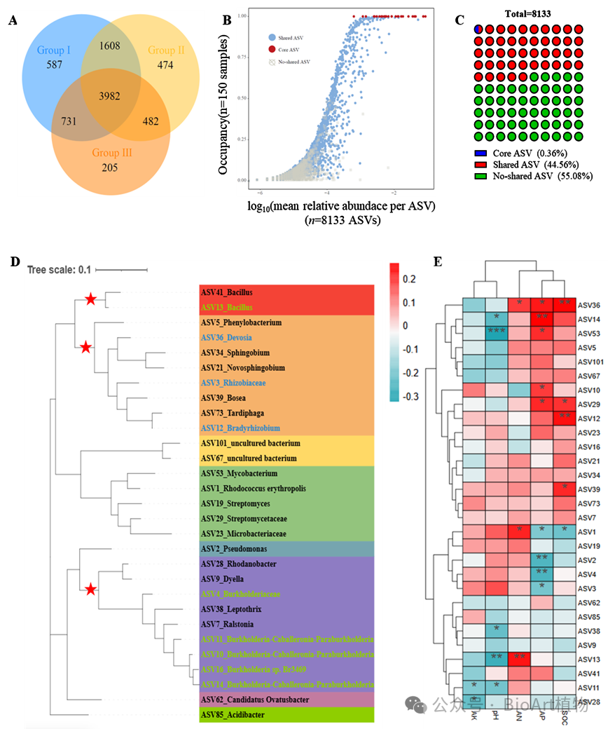 通过分析大豆种质资源根际核心微生物群,鉴定出29个系统发育保守的核心微生物(ASVs),其中大多数与根际养分有效性显著相关。值得关注的是,ASV13、ASV14和ASV12分别与根际土壤的碱解氮、有效磷和有机质显著正相关(图2)。随后,将这些核心微生物类群整合到以根瘤菌为核心的合成细菌群落中,田间试验结果进一步证实了系统发育保守的核心微生物能够驱动根际养分周转,进而促进宿主植物生长及提升宿主养分效率。