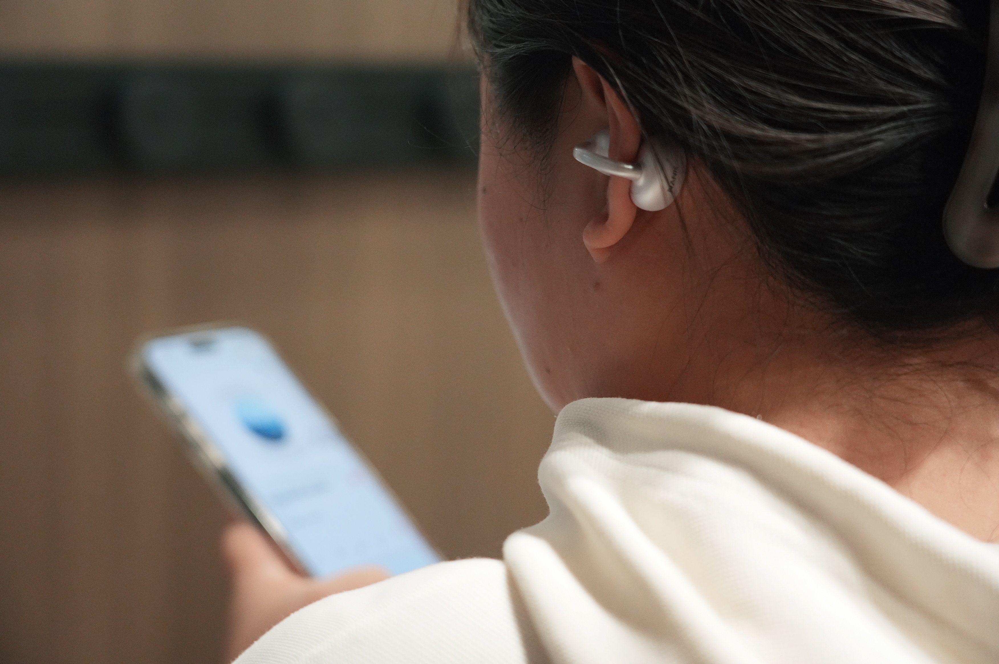 外观和佩戴感绝对是这款耳机的王牌。单耳才4.8g,戴在耳朵上几乎没存在感。我最喜欢它的耳扣设计,不是那种硬邦邦的夹子,而是有LevAir零压气囊,还加了C-Flex智能记忆弧环,弯来弯去都能恢复原状。