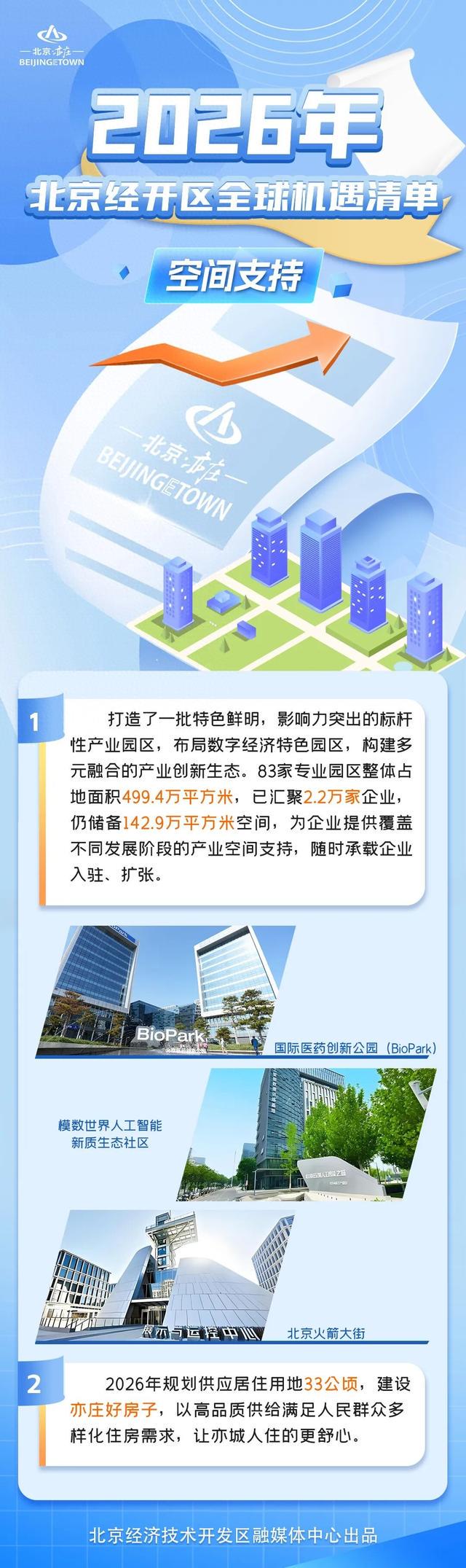 在产业空间供给方面,清单明确北京亦庄将打造一批特色鲜明、影响力突出的标杆性产业园区,面向生物医药与大健康、机器人与智能制造、新一代信息技术、现代服务业等重点领域,开放包括国际医药创新公园(BioPark)、“模数世界”人工智能新质生产力社区、全国首个商业航天共性科研生产基地“火箭大街”等在内83家高能级创新空间,预计提供产业载体近500万平方米,满足企业全周期发展需求,有力支撑企业成长壮大。同时,北京经开区着眼未来生活与产业协同发展,2026年规划供应居住用地33公顷,全力推进“亦庄好房子”工程,以高品质供给满足人民群众多样化住房需求,让亦城人住得更舒心。