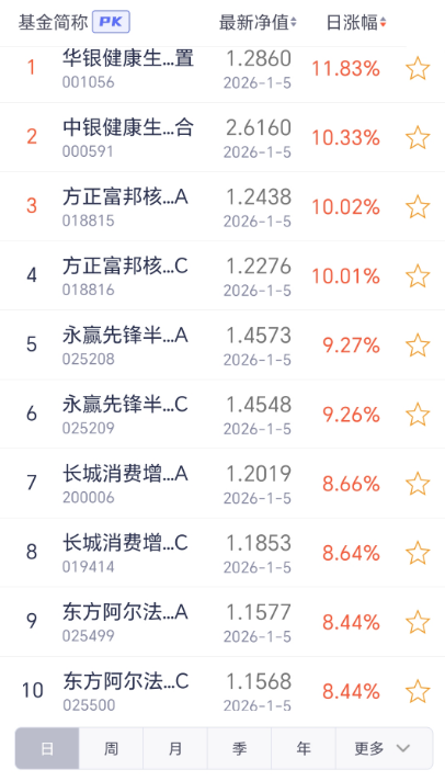 5日开放式基金净值增长排名前10的基金分别是:华银健康生活主题灵活配置、中银健康生活混合、方正富邦核心优势混合A、方正富邦核心优势混合C、永赢先锋半导体智选混合发起A、永赢先锋半导体智选混合发起C、长城消费增值混合A、长城消费增值混合C、东方阿尔法科技智选混合发起A、东方阿尔法科技智选混合发起C。