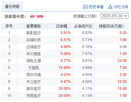 该基金十大持仓中美好医疗、伟思医疗20% 涨停,天智航-U涨幅逾10%,联影医疗、奕瑞科技、迈瑞医疗、华大智造、微电生理、澳华内镜、开立医疗涨幅较大,前十持仓占总持仓的60.58%,基金风格属于医药行业,基金净值相对跑赢市场(属于医药行业创新医疗方向的主动型混合基金) 【基金规模0.90亿元】。净值增长较差的是华宝海外新能源汽车股票发起式(QDII)A,