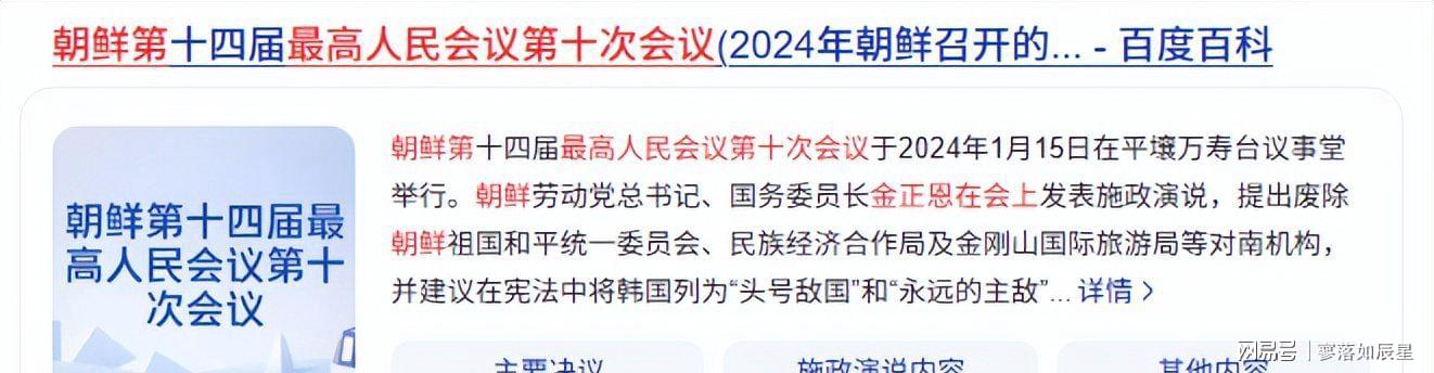 2024年初,金正恩在朝鲜最高人民会议第十次会议上宣布放弃半岛一体化诉求,明确朝韩为敌对国家关系。