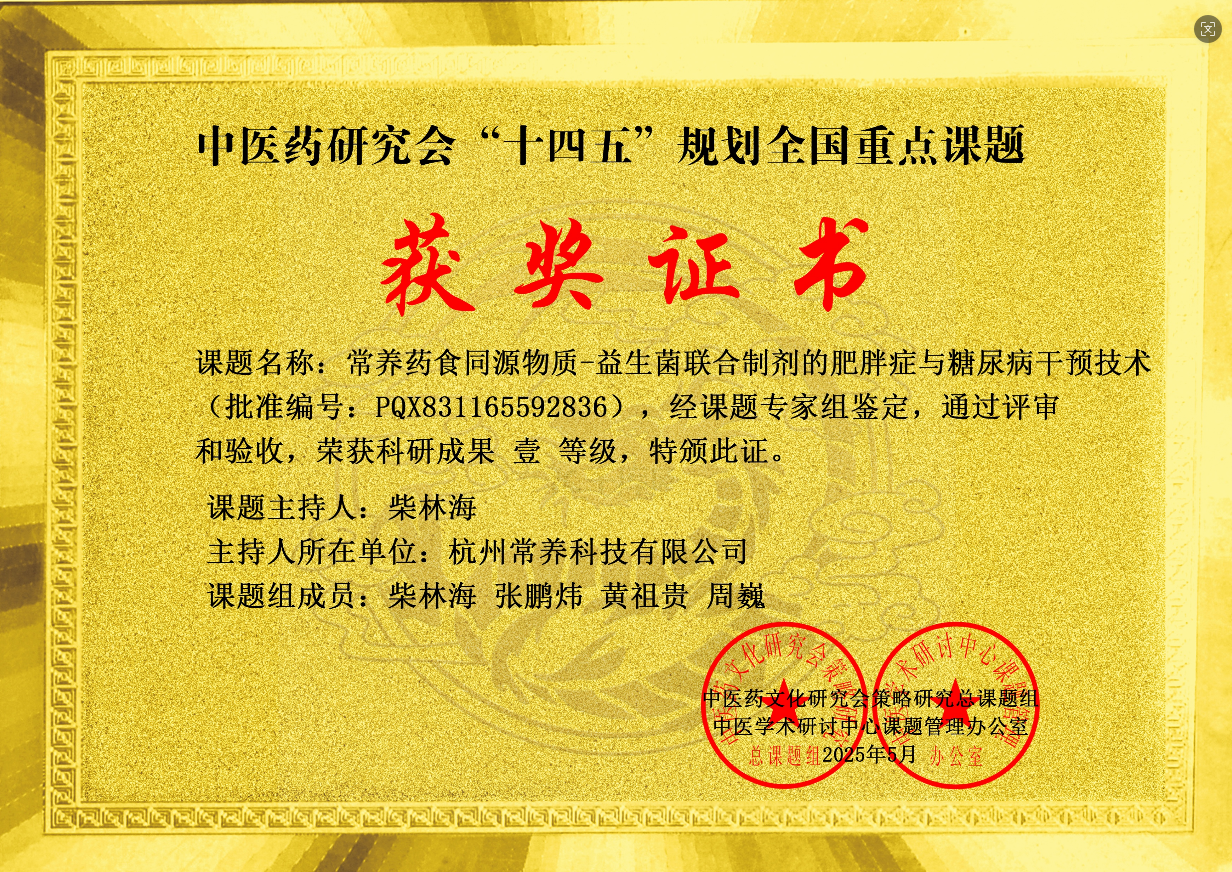 国家级课题认可:其核心技术“常养药食同源物质-益生菌联合制剂的肥胖症与糖尿病干预技术”荣获中医药研究会“十四五”规划全国重点课题立项,这是对其科研价值与有效性的高度认可。