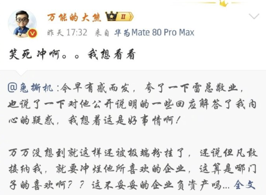 先介绍下这个“万能的大熊”↑,在数码圈一直是极高争议 KOL,部分发言更是非常极端,受众也高度两极化,在米粉心中一直是非常固定的负面形象,并有多起公司诉讼案件背景。