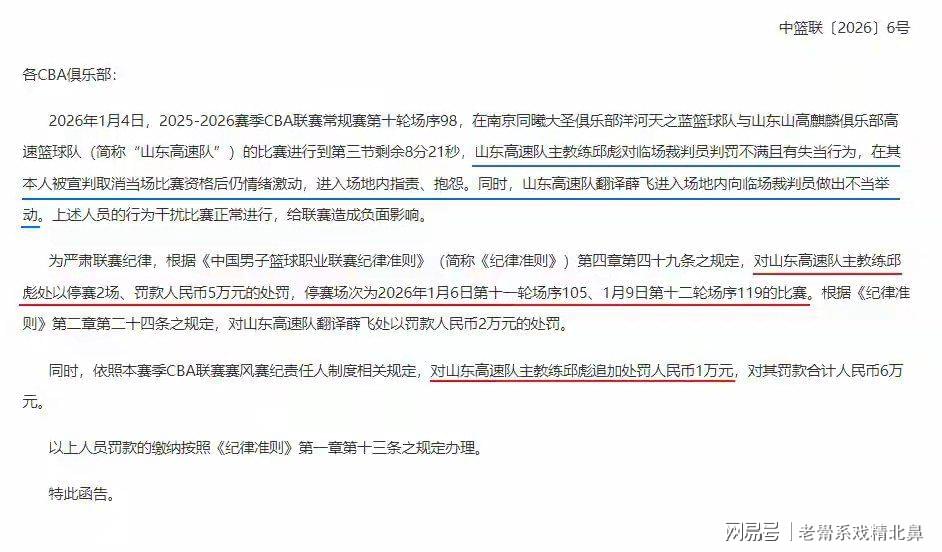 “根据《中国男子篮球职业联赛纪律准则》(简称《纪律准则》)第四章第四十九条之规定,对山东高速队主教练邱彪处以停赛2场、罚款人民币5万元的处罚,停赛场次为2026年1月6日第十一轮场序105、1月9日第十二轮场序119的比赛。根据《纪律准则》第二章第二十四条之规定,对山东高速队翻译薛飞处以罚款人民币2万元的处罚。”。