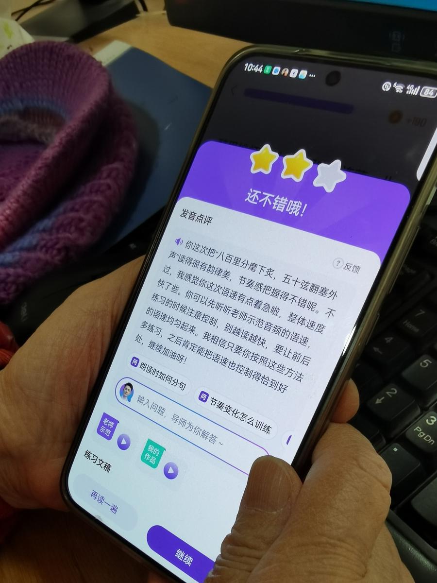 录制时,读到“八百里分麾下炙,五十弦翻塞外声”时,她刻意加速,以此体现沙场氛围。读完后,AI根据发音完整度、流利度等指标给出评分:两颗星。同时生成评价:“加速读的两句确实有韵律美,然而后面就开始越读越快,反而出现语速不均匀的问题。”