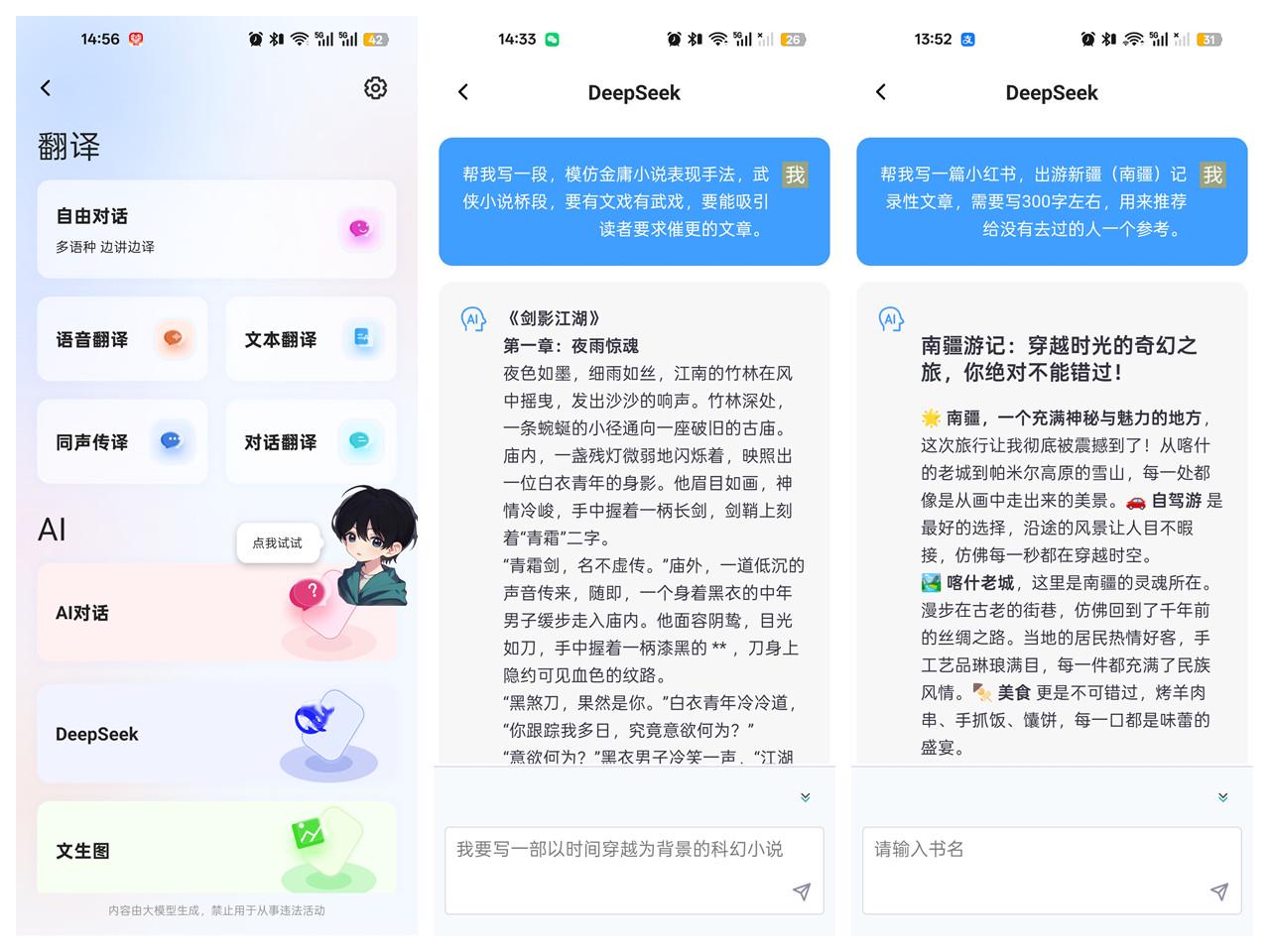 不仅如此,在南卡APP内还提供了现在流行的AI功能。看的出来是南卡和讯飞及DeepSeek大模型合作的内容,可以自由对话、语言翻译、文本翻译、甚至可以AI生图、AI创作写一些有趣的内容。不禁让人感慨现在的AI真的是非常普及,连无线蓝牙耳机内有能有AI影子。真是科技改变生活,你不一定要会用AI但是你不能不拥有AI啊,南卡的做法是很正确的。
