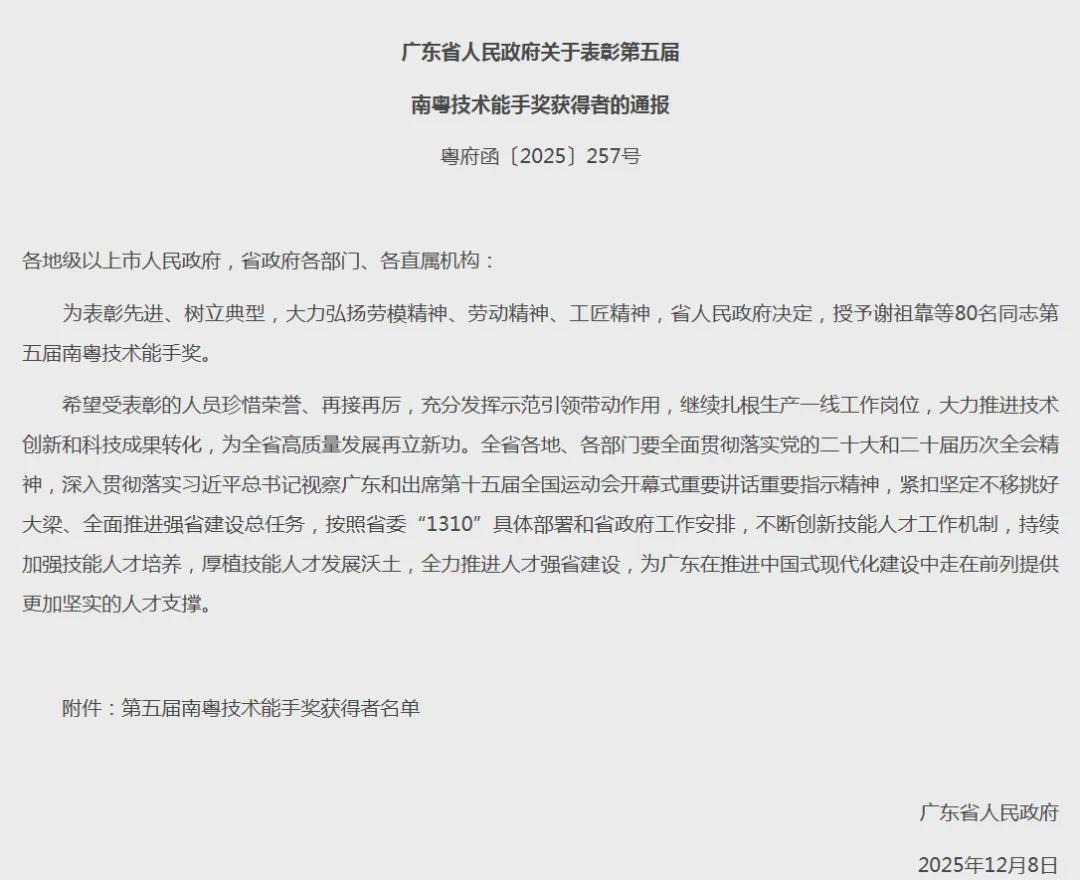 《关于表彰第五届南粤技术能手奖获得者的通报》