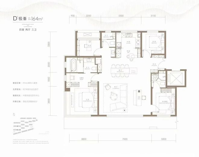 建面约164平米的四居三卫,还是分中户和边户,其实就是136的放大版,只不过南向变成了双套房设计。