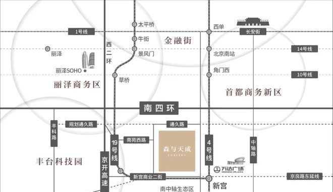 四环旁约1KM,4号线19号线交汇。首都商务新区约3KM,丰台科技园约4KM,丽泽金融商务区约5KM(直线距离)。