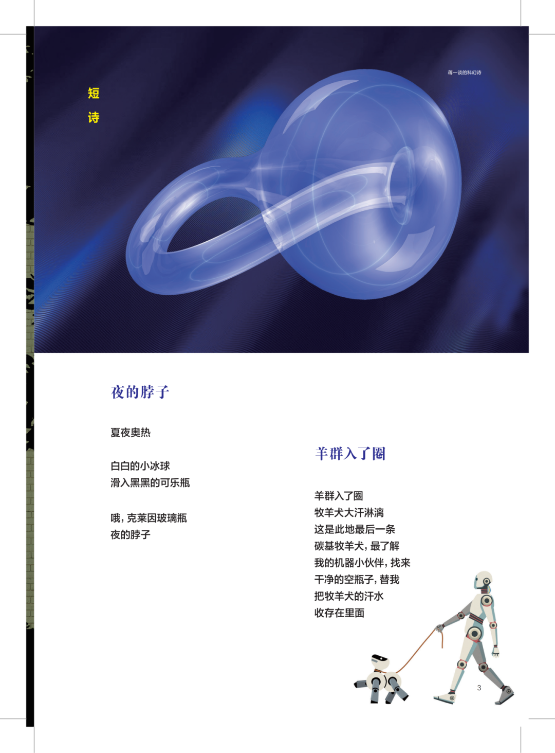 当诗歌遇见科幻,词语便有了重力,意象便有了轨道。本期特别企划栏目《蒋一谈的科幻诗》刊登了诗人、小说家蒋一谈的科幻短诗《夜的脖子》《羊群入了圈》《起飞之前的自我检查》等,组诗《太极拳》与截句。在这些精练而充满想象力的诗行中,科技不是冰冷的装置,而是情感的容器、记忆的载体、存在本身的隐喻。机器人会收藏主人的汗水,人类想把身体改成机器,夜空是岩壁,星星是篝火,光视死如归……他用诗歌探索人类与机器、身体与意识、存在与虚无的边界。