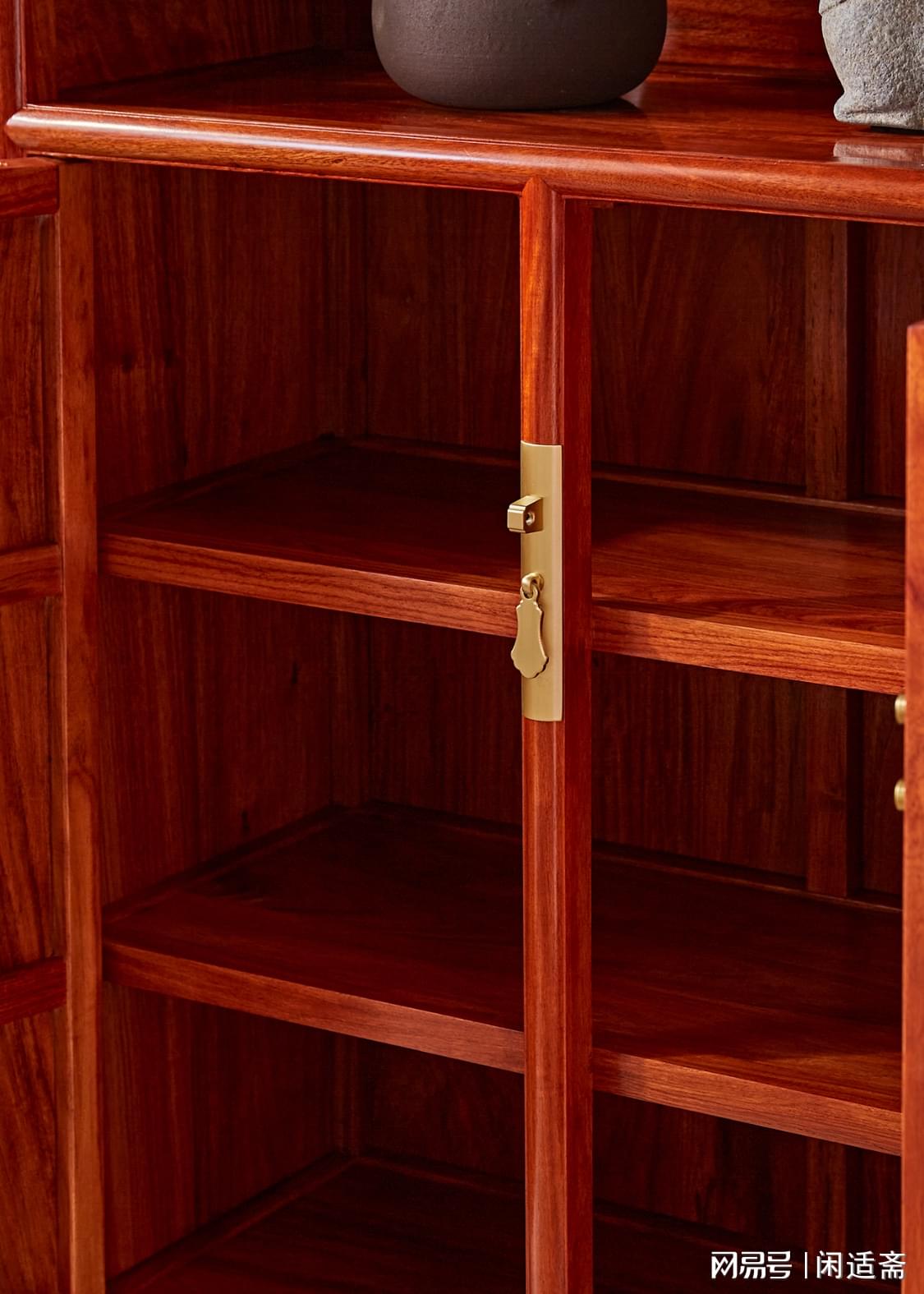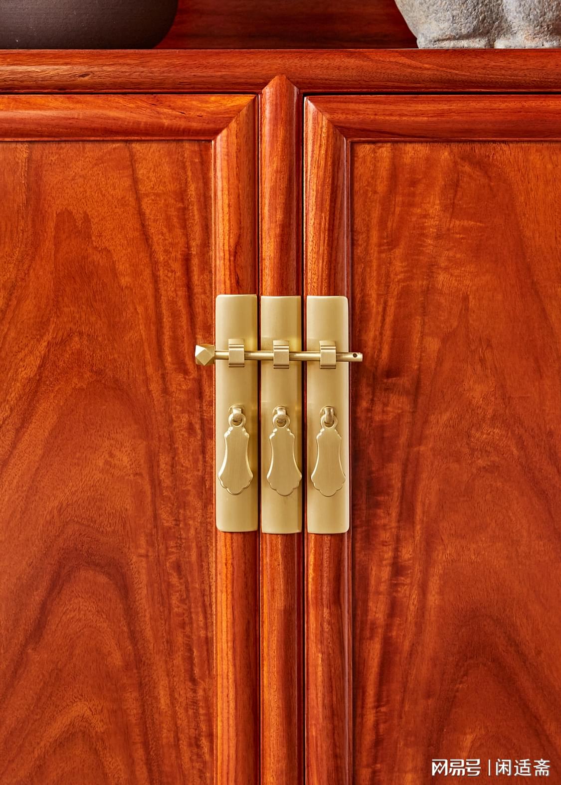 此柜通体甄选优质缅甸花梨木打造,木色醇厚雅致,呈黄褐色至红褐色渐变,肌理间可见清晰的水波纹、虎皮纹等天然纹路,独一无二且极具观赏性;木材自带淡淡的檀木清香,轻嗅便能感受雅致韵味,兼具安神静心之效。