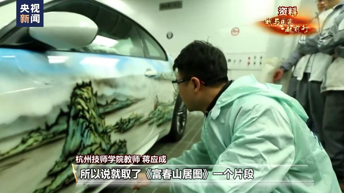 杭州技师学院教师 蒋应成:当时也是想着在技术方面做一些创新突破,想着不光是可以喷漆,还可以做一些艺术品。桐庐是《富春山居图》的实景地,所以就取了《富春山居图》一个片段,把它喷在车上。