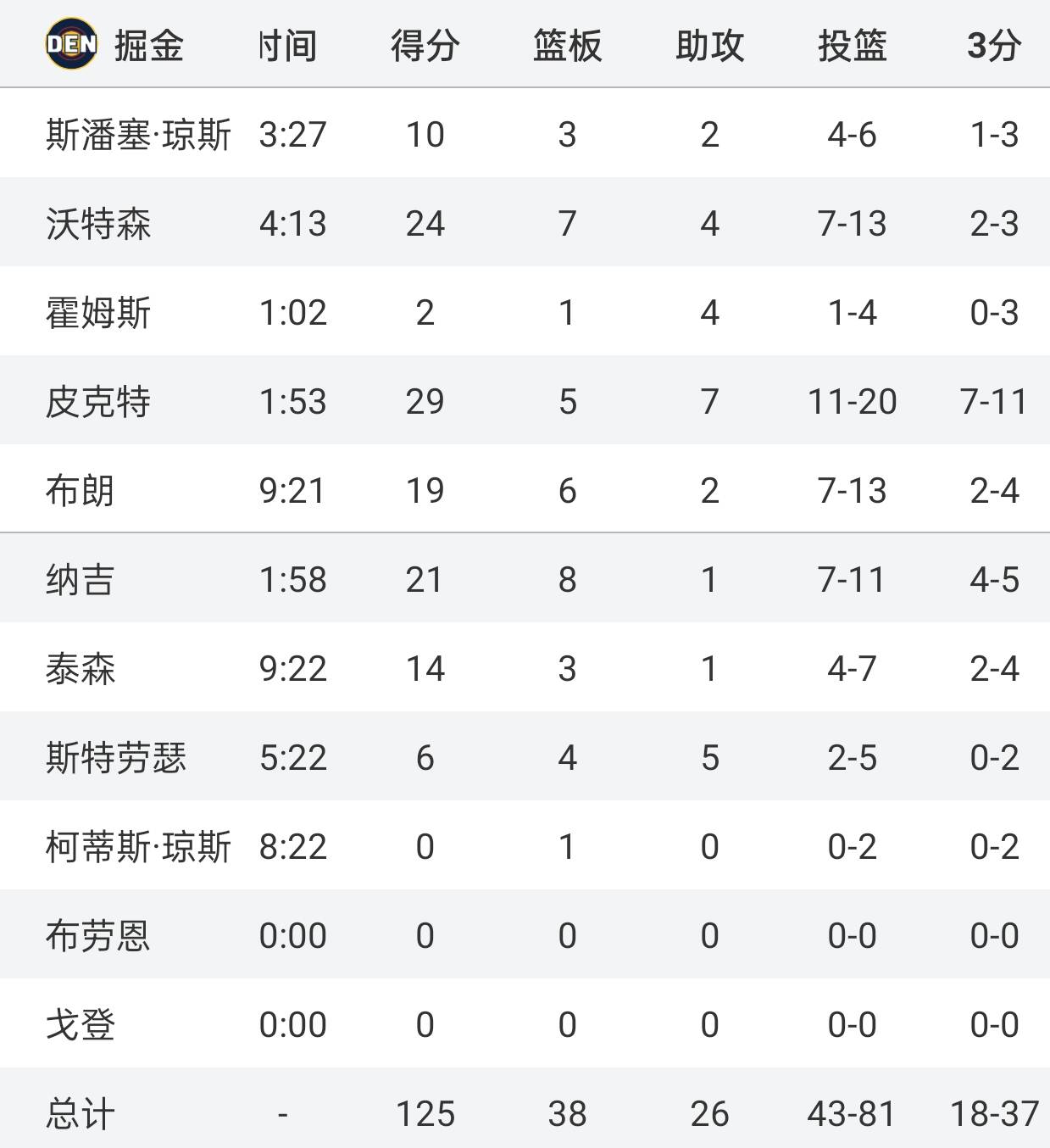 这场比赛,掘金虽然主力全部缺阵,但他们却打的非常顽强,球队进攻端火力全开,无论是中距离还是三分球,命中率都极高,他们一直和76人僵持到最后,并最终靠着加时赛上布朗的上篮准绝杀,成功以125:124赢下比赛。此战掘金这边皮克特20中11,三分11中7砍下29分5篮板7助攻,沃特森则是13中7得到24分7篮板4助攻,布朗也是13中7拿下19分6篮板2助攻。
