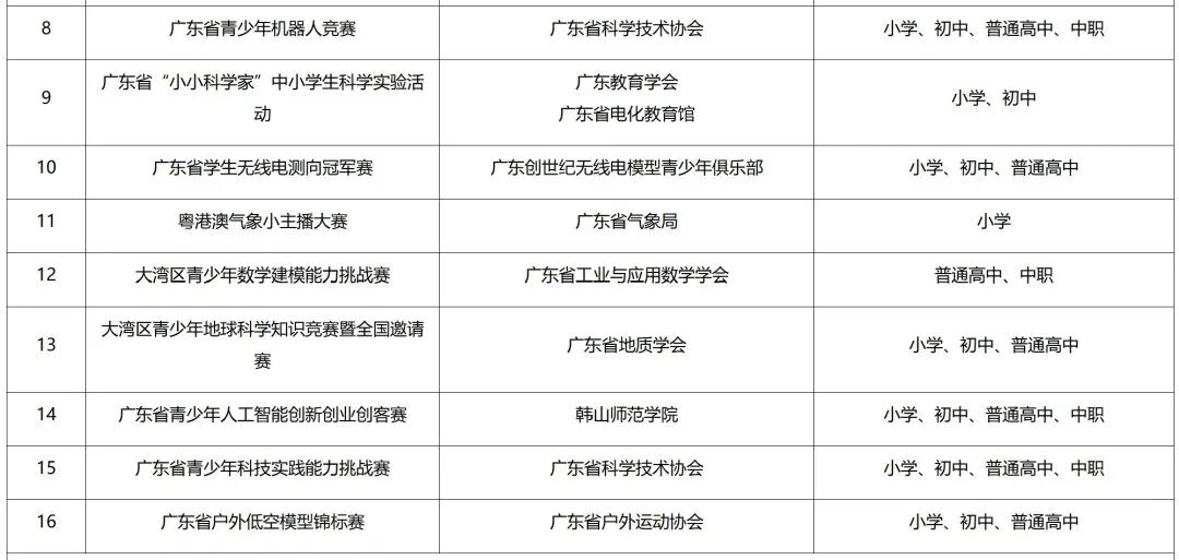 13.广东省科学技术协会:广东省青少年科技创新大赛,竞赛面向初中、普通高中、中职。