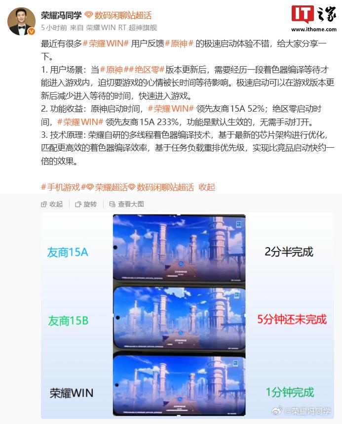IT之家 1 月 6 日消息,荣耀游戏研发工程师 @荣耀冯同学 今日发文详细介绍了 WIN 系列手机的「极速启动」功能: