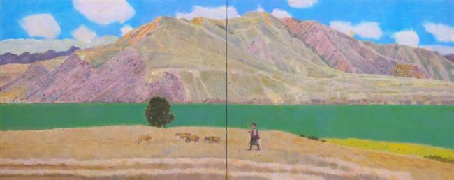 新疆的写生之作,将光影的纯粹与神圣推向极致。雪山、草原、湖泊构成的壮阔景观,在王力克笔下呈现出强烈的明暗对比与色彩张力。晨光中,雪山峰顶被染成熔金般的暖黄,边缘泛着神圣的橙红,而背光处的深褐山影则勾勒出坚毅轮廓;正午的草原上,光线澄澈透亮,草叶的亮边与地面的阴影形成精准的明暗节奏,尽显生命的蓬勃活力。他以“光影折叠术”将晨昏的色彩浓缩于画面,蓝白交织的冰川、金绿相间的草原、碧蓝如镜的湖泊,在光影的调和下既保留了新疆风光的原生之美,又赋予其超越视觉的精神维度。厚重的颜料堆积出雪山的肌理,灵动的笔触描绘出湖面的波光,让每一幅作品都成为对自然永恒与光影瞬息的双重礼赞。