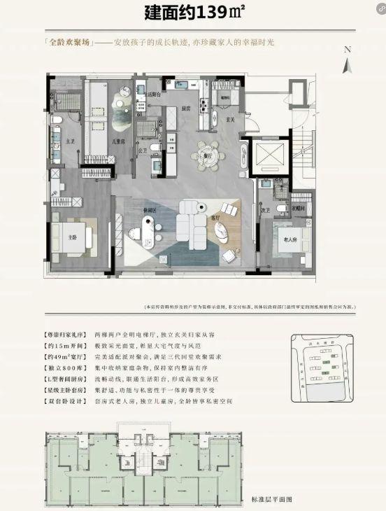 主卧和老人房为双套房,三代同堂也能互不打扰。该户型将赠送面积拉满,得房率达约120%,相当于旧规180㎡大平层。