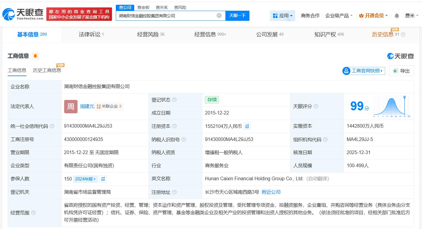 雷达财经讯,天眼查工商信息显示,近日,湖南财信金融控股集团有限公司发生工商变更,注册资本由144.28亿人民币增至约155亿人民币,增幅约8%。