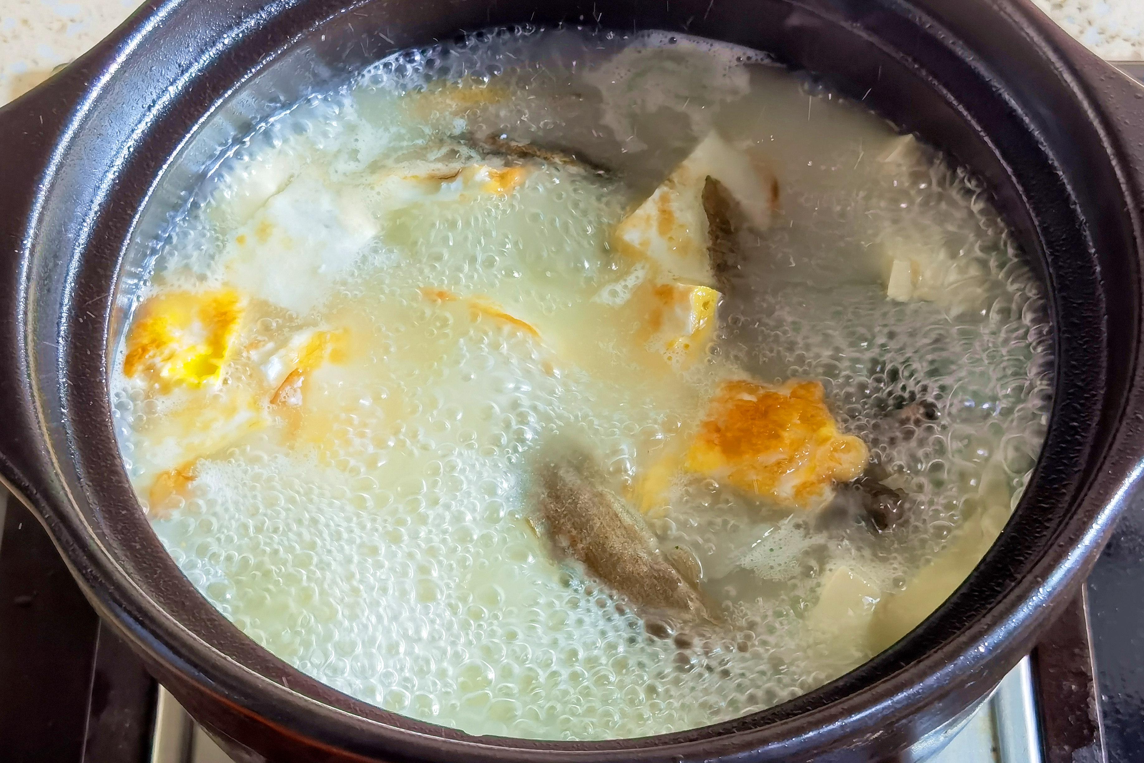 关键步骤来了!立刻倒入足量滚烫的开水,水量要一次性加够,中途尽量不加水。这时你会看到汤汁迅速变白,像牛奶似的——这就是蛋白质和油脂乳化产生的效果。大火煮开,撇掉浮沫。