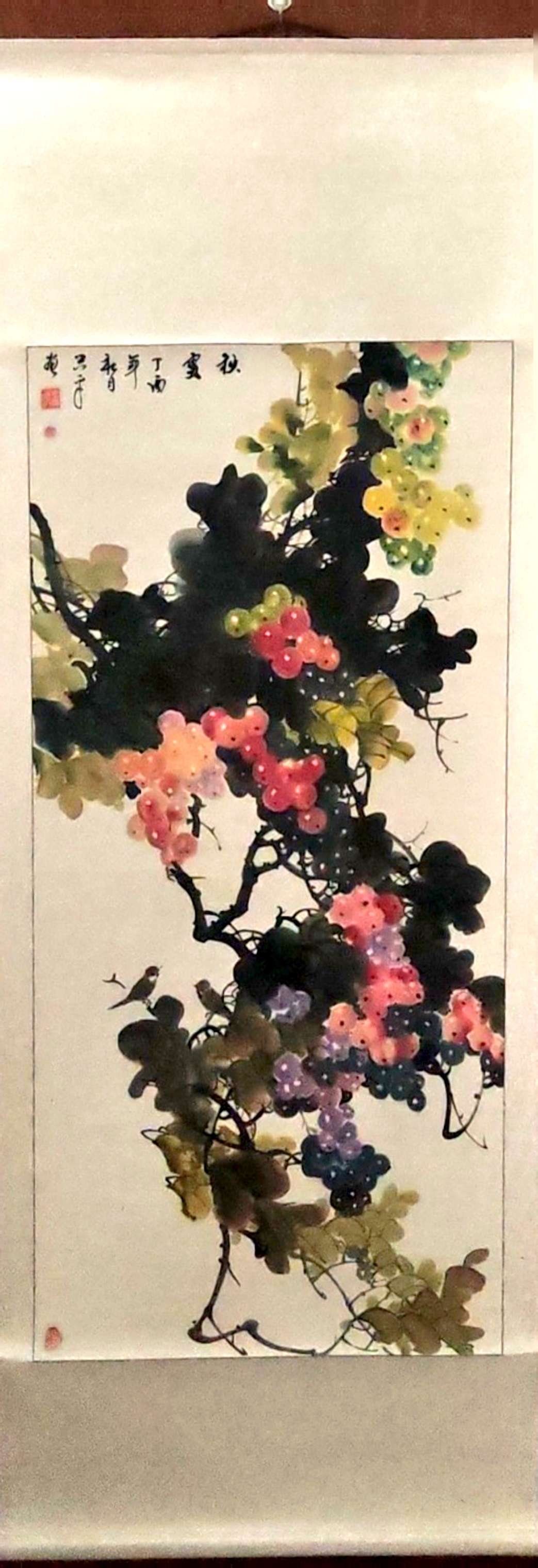 藏品介绍:秋实(葡萄) 作者:王兴平 画心:133×68cm 画轴:210×80cm