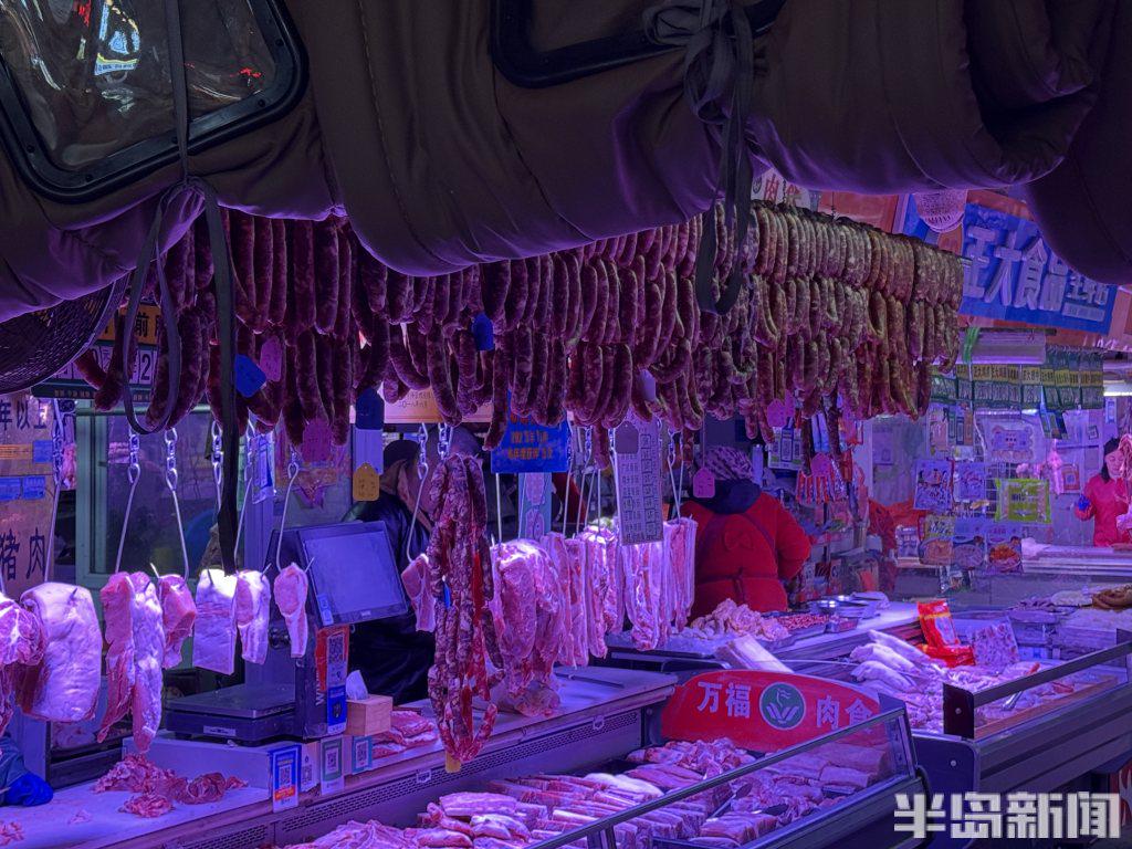 记者在团岛市场看到,多家肉铺和熟食加工摊位前已挂起了一排排刚灌制好的香肠,色泽红润油亮,在光照下显得格外诱人。商户们正手脚麻利地处理着新鲜的猪肉,绞肉、配料、搅拌、灌肠、扎线……一道道工序有条不紊。据一位经营了十余年灌肠生意的老师傅介绍,每年春节前是灌肠的黄金时段,近期日均加工量可达数百斤。“来灌肠的市民比往年更多,很多人一订就是几十斤,有自己吃,也有寄给外地亲友的。”