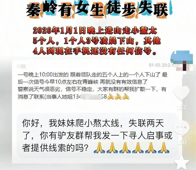 近日,有网友在社交平台发布寻人启事,称自己妹妹在1月1日晚上出发,跟着领队一共5人进山走“小鳌太线”后失联至今。