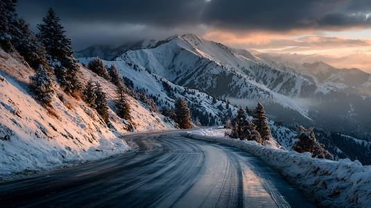 沿着蜿蜒的雪地公路前行,两旁的雪山在夕阳的映照下显得格外壮丽。每一座山峰都像是大自然用最细腻的笔触描绘的艺术品,它们在阳光下闪烁着晶莹的光芒,为这片宁静的雪地增添了生机与活力。