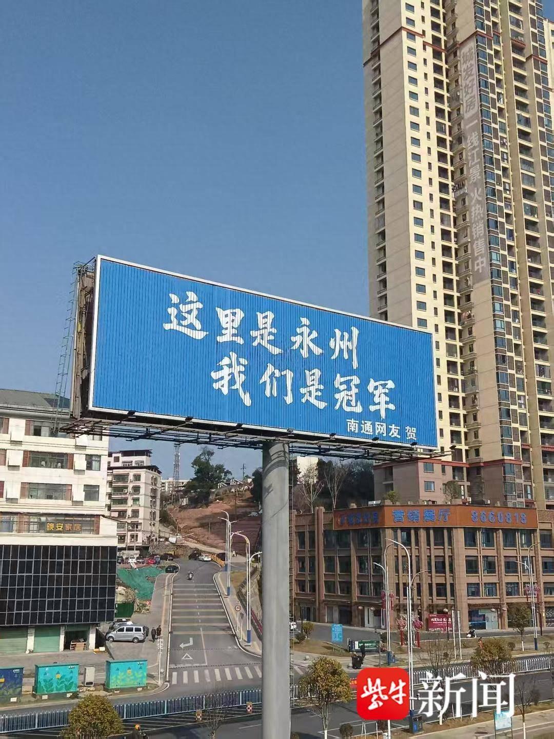 “我们广告牌的尺寸更大,位置更好、人流更多。”1月6日上午,南通网友打出的“这里是永州 我们是冠军”巨幅祝贺广告牌,在湖南永州潇湘大桥的桥头堡亮相。这是继苏州、南京网友赞助的广告牌先后亮相,泰州、常州等地网友也“快马加鞭”,加入到给永州“上牌”的队列中。