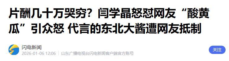 《片酬几十万哭穷?闫学晶怒怼网友“酸黄瓜”引众怒 代言的东北大酱遭网友抵制》闪电新闻2026-01-06 12:06