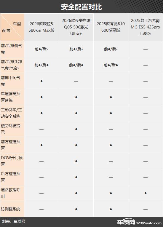 本次挑选的四款车型分别为2026款 欧拉5 ( 参数 丨 图片 ) 580km Max版(以下称:欧拉5)、2026款长安启源Q05 506激光Ultra+(以下称:长安启源Q05)、2025款零跑B10 600悦享版(以下称:零跑B10)和2025款上汽名爵MG ES5 425pro 后驱版(以下称:名爵MG ES5)。四款车型不仅产品特点和市场定位接近,价格也处于同一区间内,都较为亲民(由于目前图片数量较少,因此部分车型的图片并不是相对应的具体款型)。