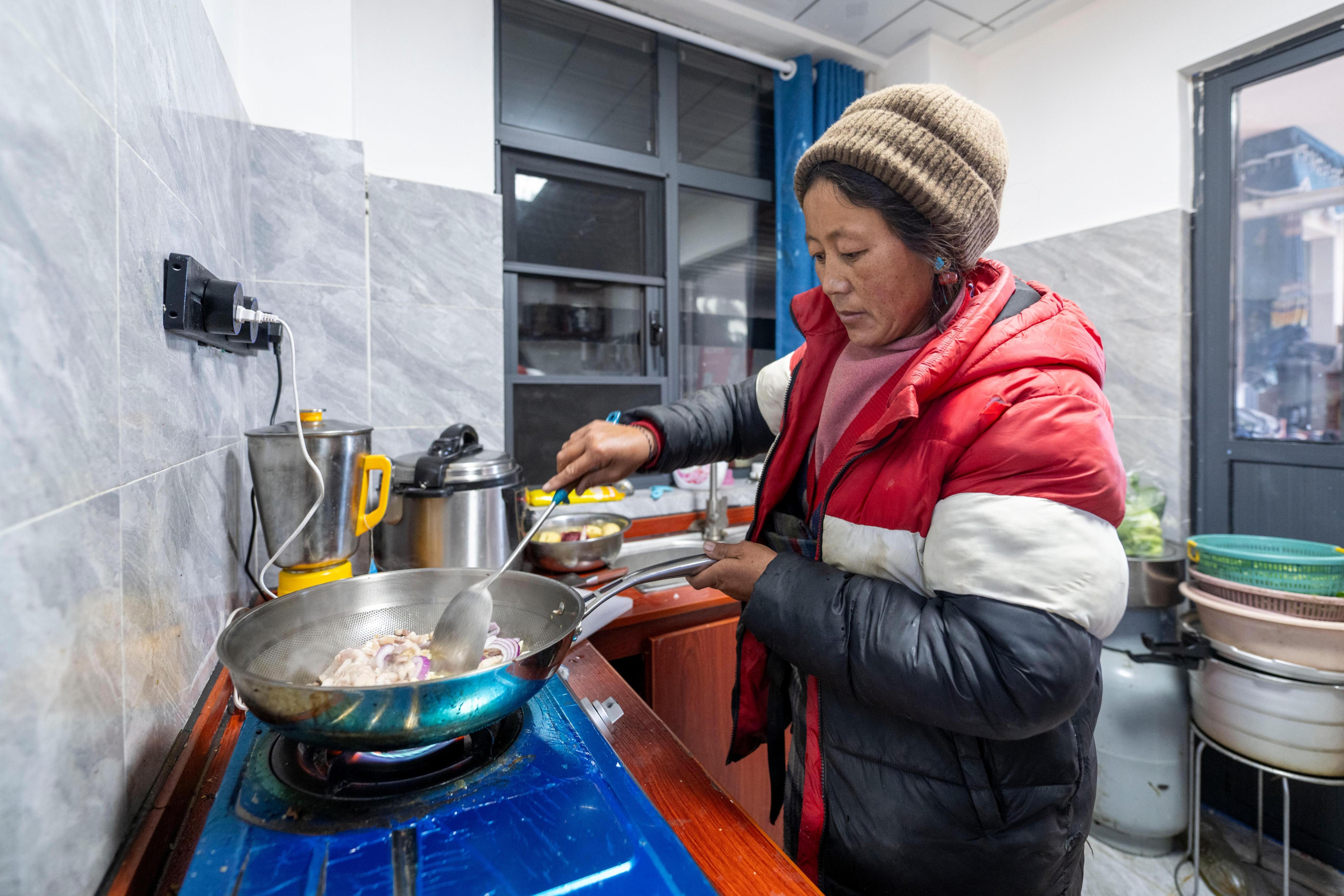 2025年12月11日,在西藏定日县长所乡古荣村,村民塔决在新家宽敞明亮的厨房中准备午饭。人民网记者 翁奇羽摄